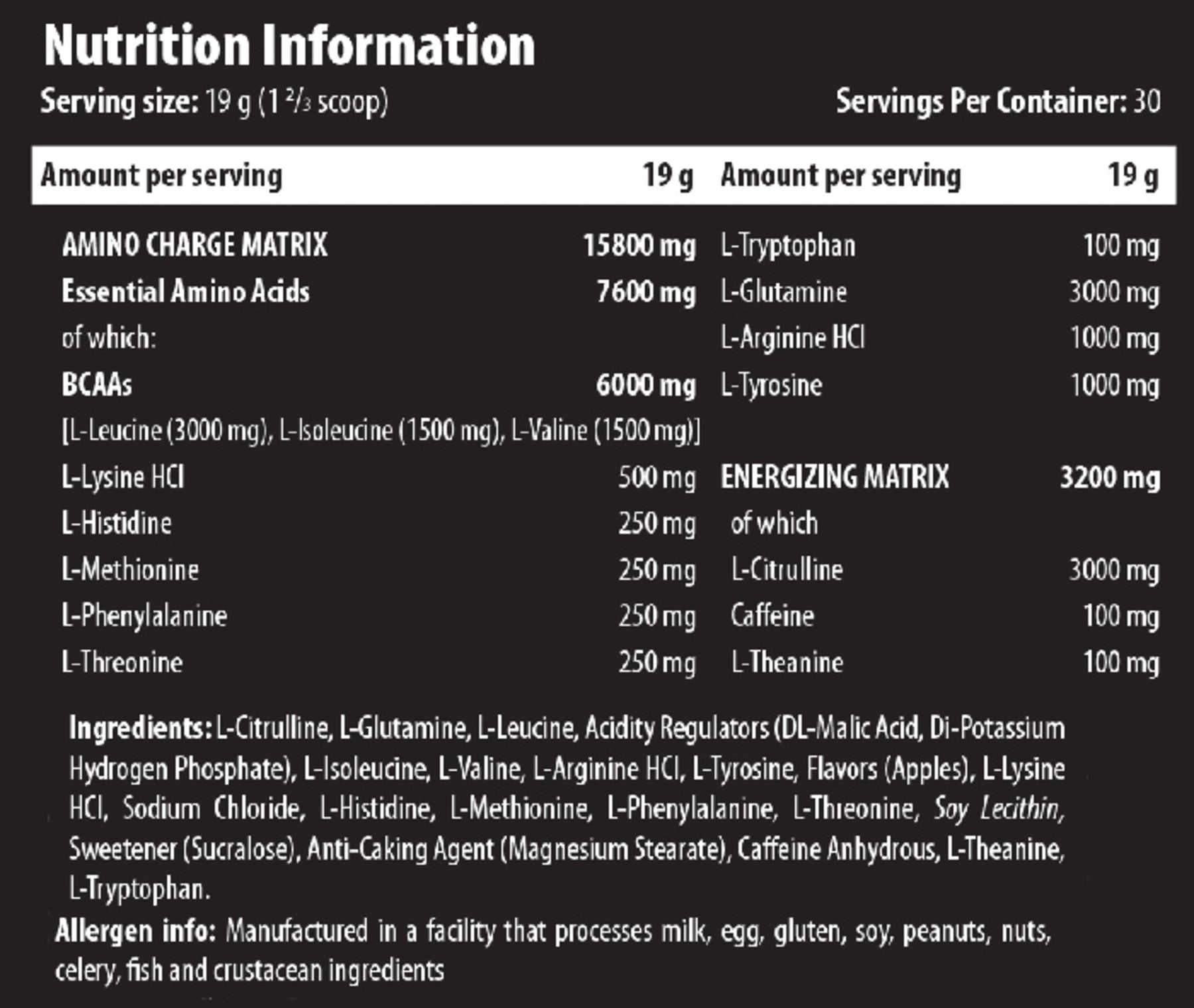 Peach: L-Citrulline, L-Glutamine, L-Leucine, Acidity Regulators (DL-Malic Acid, Di-Potassium Hydrogen Phosphate), L-Isoleucine, L-Valine, L-Arginine HCl, L-Tyrosine, Flavor (Peach), L-Lysine HCl, Sodium Chloride, L-Histidine, L-Methionine, L-Phenylalanine, L-Threonine, Soy Lecithin, Sweetener (Sucralose), Anti-Caking Agent (Magnesium Stearate), Caeine Anhydrous, L-Theanine, L-Tryptophan Apple: L-Citrulline, L-Glutamine, L-Leucine, Acidity Regulators (DL-Malic Acid, Di-aPotassium Hydrogen Phosphate), L-Isoleucine, L-Valine, L-Arginine HCl, L-Tyrosine, Flavors (Apples), L-Lysine HCl, Sodium Chloride, L-Histidine, L-Methionine, L-Phenylalanine, L-Threonine, Soy Lecithin, Sweetener (Sucralose), Anti-Caking Agent (Magnesium Stearate), Caeine Anhydrous, L-Theanine, L-Tryptophan Bubble Gum: L-Citrulline, L-Glutamine, L-Leucine, Acidity Regulators (DL-Malic Acid, Di-Potassium Hydrogen Phosphate), L-Isoleucine, L-Valine, L-Arginine HCl, L-Tyrosine, Flavors (Kiwi, Melon, Apricot), L-Lysine HCl, Sodium Chloride, L-Histidine, L-Methionine, L-Phenylalanine, L-Threonine, Soy Lecithin, Sweetener (Sucralose), Anti-Caking Agent (Magnesium Stearate), Caffeine Anhydrous, L-Theanine, L-Tryptophan.