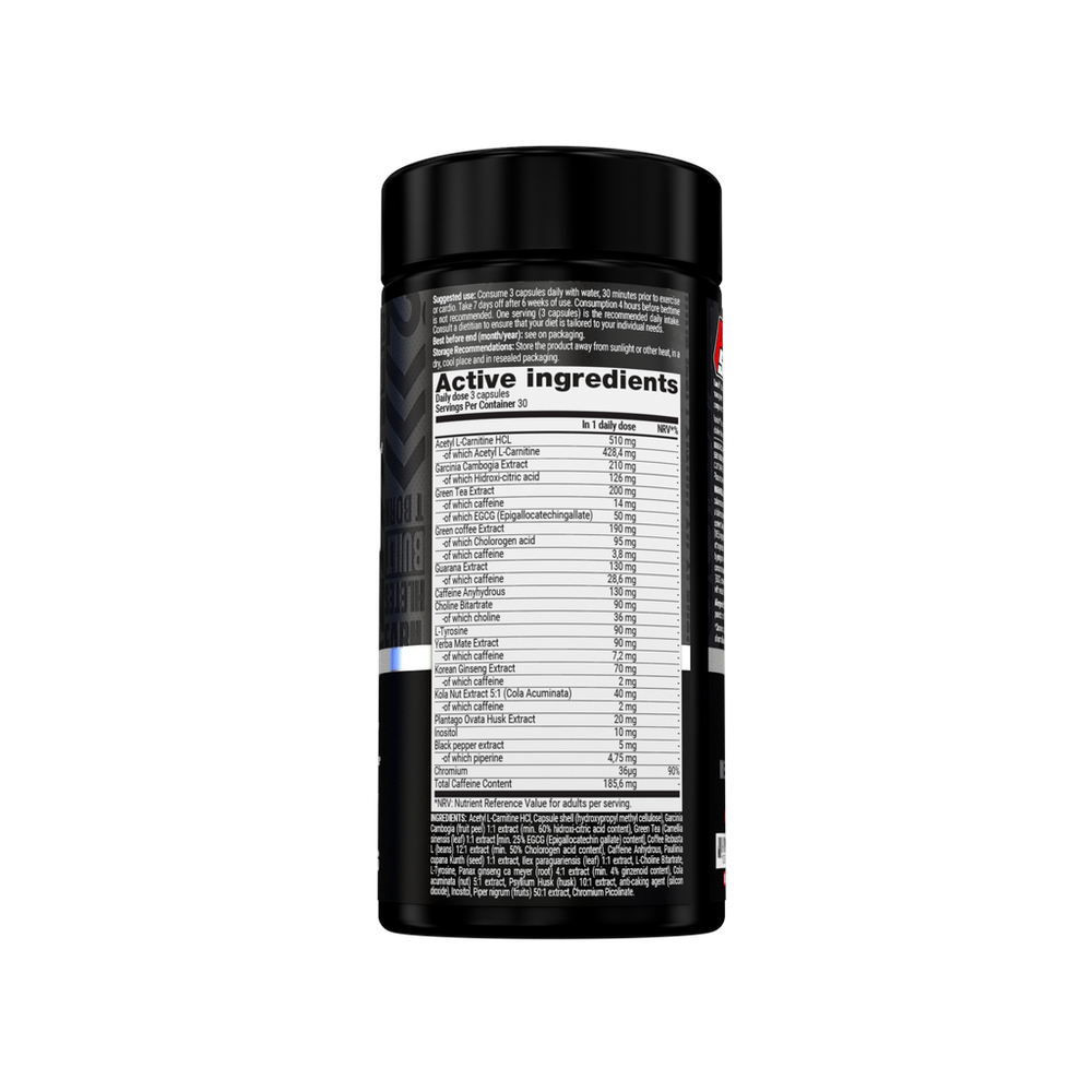 Acetil L-Carnitină HCl Capsulă: gelatină vegetală (hidroxipropil metilceluloză) Extract de Garcinia Cambogia (fruct) 1:1 – min. 60% conținut de acid hidroxicitric Extract de Ceai Verde (Camellia sinensis, frunză) 1:1 – min. 25% EGCG (Epigalocatechin galat) Extract de Cafea Verde (boabe de Coffea robusta) 12:1 – min. 50% conținut acid clorogenic Cofeină anhidră Extract de Guarana (Paulina cupana, semințe) 1:1 Extract de Yerba Mate (Ilex paraguariensis, frunze) 1:1 Bitartat de colină L-Tirozină Extract de Ginseng Coreean (Panax ginseng, rădăcină) 4:1 – min. 4% conținut de ginsenozide Extract de Cola (Cola acuminata, fruct) 5:1 Extract de Psyllium Husk (Plantago ovata) 10:1 Agent antiaglomerant: dioxid de siliciu Inozitol Extract de piper negru (Piper nigrum, fructe) 50:1 Picolinat de crom