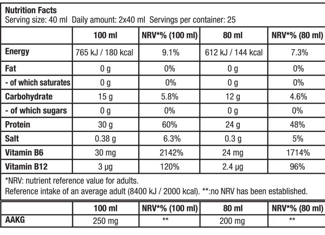 În plus Liquid Amino a fost dozat și cu vitamina B6 și B12 care contribuie la reducerea oboselii. Vitamina B6 contribuie la metabolismul normal al proteinelor și glicogenului.