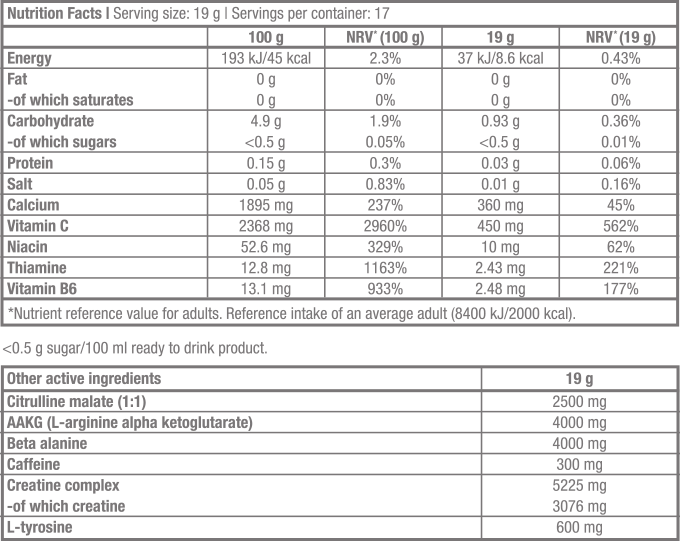 Black Blood NOX+ este un praf de băutură complex pentru utilizare înaintea antrenamentelor, conținutul de *niacină și vitamina B6 participă la procesele metabolice normale generatoare de energie și contribuie la reducerea oboselii și extenuării. Vitamina B6, niacina și tiamina contribuie la menținerea funcțiilor psihologice normale. Pe lângă conținutul ridicat de cofeină, produsul include și creatină, care crește performanța fizică în timpul exercițiilor scurte, repetate, de intensitate ridicată.** Aflată în compoziția produsului, vitamina C contribuie la menținerea funcționării normale a sistemului imunitar în timpul exercițiilor fizice intense și ulterior acestora.***