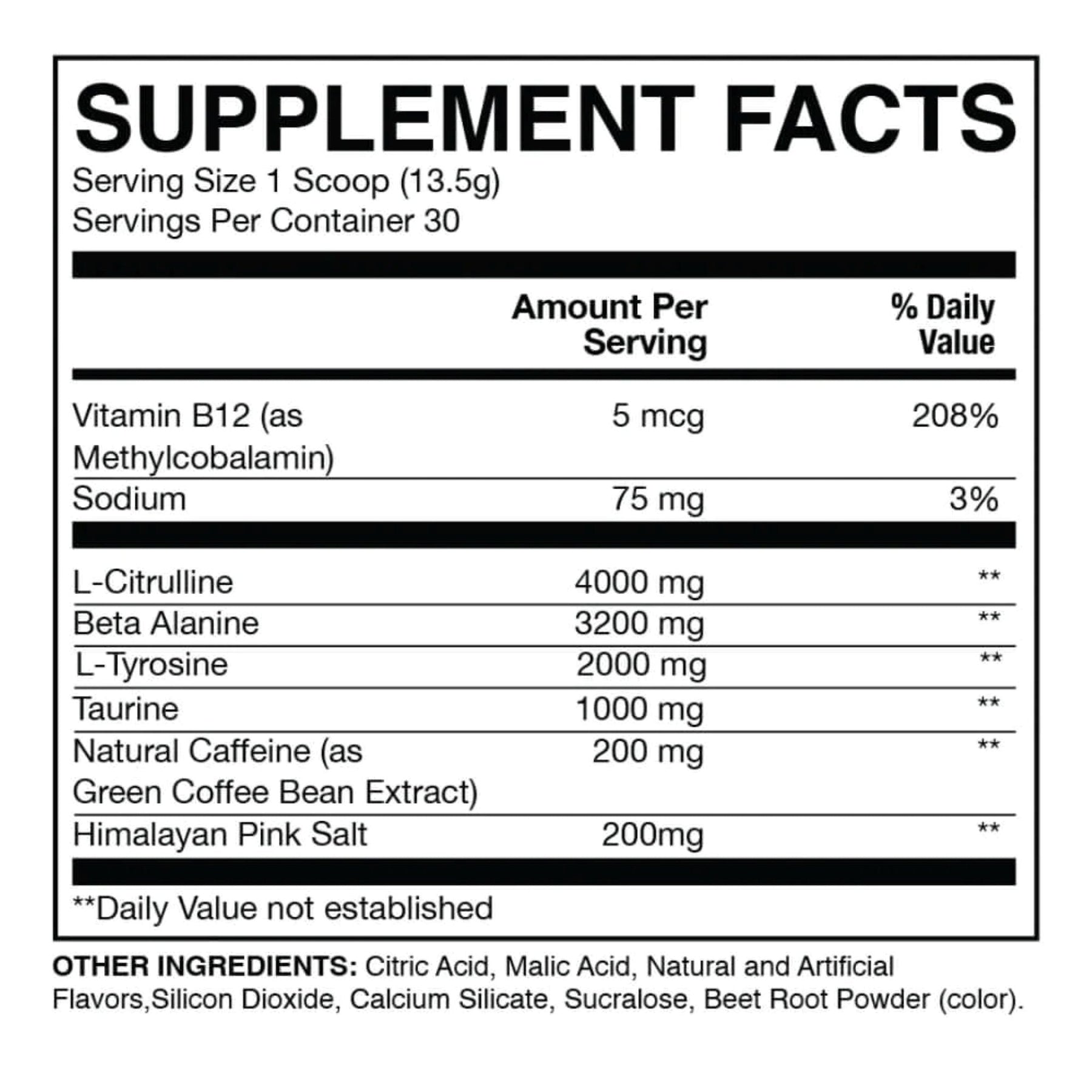 Formula CBUM Essentials include 4 g de citrulină pură pentru pomparea musculara excelenta și recuperare mai rapidă, 3,2 g de beta-alanină pentru a crește rezistența și timpul până la epuizare, 1 g de taurină pentru a optimiza hidratarea celulară și a maximiza funcția musculară, 2 g de tirozină pentru o concentrare mentală mai bună și energie, 200 mg de sare roz de Himalaya pentru a susține hidratarea și echilibrul electrolitic și 200 mg de cofeină naturală pentru energie susținută.
