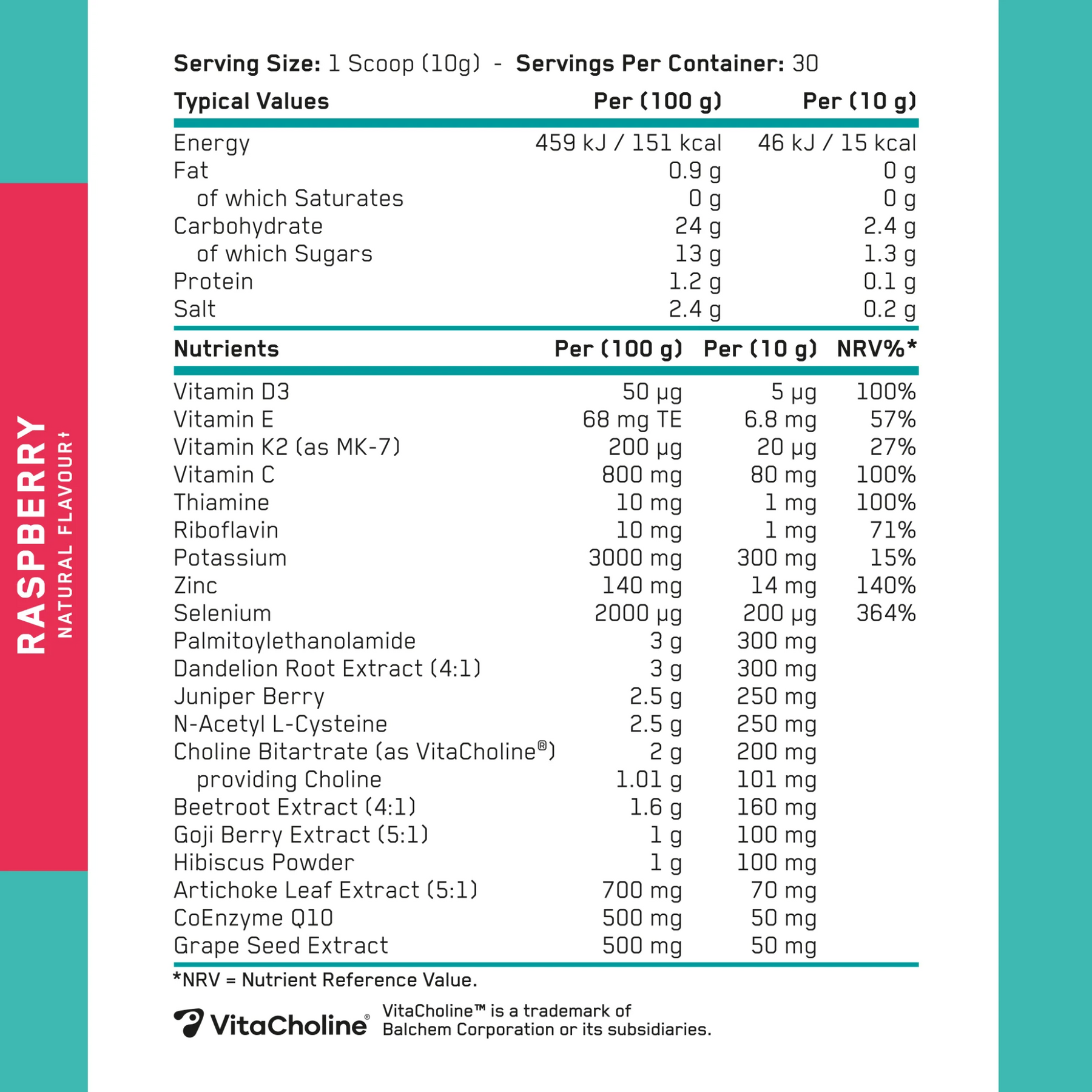 Pentru Aroma de Peach: Inulină, maltodextrină, acid (acid citric), aromă, agent antiaglomerant (dioxid de siliciu), palmitoiletanolamidă, extract de rădăcină de păpădie (4:1), citrat de potasiu, N-acetil L-cisteină, bitartrat de colină (sub formă de VitaCholine®), boabe de ienupăr, îndulcitor (sucraloză), extract de sfeclă roșie (4:1), extract de semințe de struguri, Pudră de hibiscus, Vitamina C (acid L-ascorbic), Extract de frunze de anghinare (5:1), Vitamina E (acetat de DL alfa-tocoferil), Extract de fructe de goji (5:1), Coenzima Q10, Vitamina K2 (menaquinonă-7 (MK7)), vitamina D3 (colecalciferol), coloranți (caroteni, roșu de sfeclă roșie), bisglicinat de zinc, tiamină (vitamina B1), riboflavină (vitamina B2), seleniu (L-selenometionină).