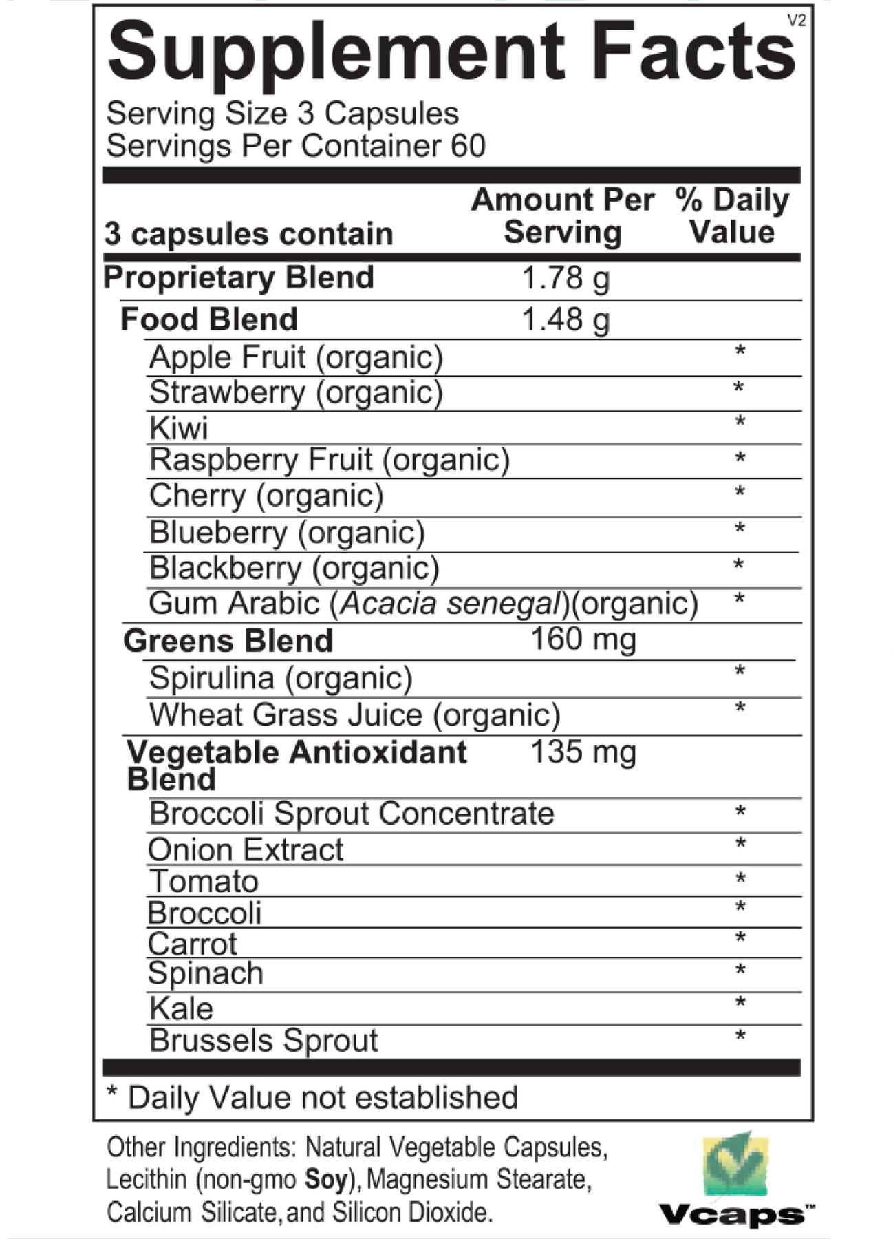 Amestec brevetat, amestec alimentar -fructe( pudră organică de mere,pudra organica de capsuni,pudră de kiwi,pudră de fructe de zmeură,pudră de cireșe,pudră de mure,pulbere de ananas,puma arabica organica -acacia senegal), amestec de verdeturi ( spirulina organica, suc de iarba de grau organic), amestec de antioxidanti vegetali germeni de broccoli concentrat ,extract de ceapa, pudra de rosii, pulbere de broccoli ,pudră de morcov,pulbere de spanac,pulbere de varza,pulbere de varza de Bruxelles) capsula vegetala (Vcaps) ,lecitina de soia (soia nemodificata genetic ),stearat de magneziu (emulgator ) ,dioxid de siliciu (agent antiaglomerant ), silicat de calciu