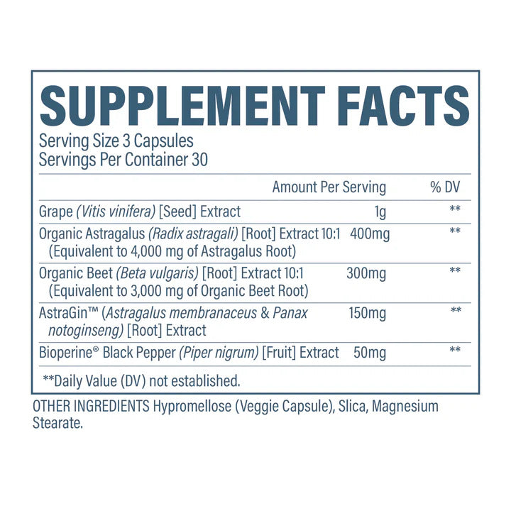 Extract din seminte de struguri (Vitis vinifera ), extract din radacina de Astragalus ( Astragalus membranaceus ),extract din radacina de Sfecla- rosie (Beta vulgaris ) AstraGin®- extract derivat din (Astragalus membranaceus & Panax Notoginseng) Bioperine® -extract din fruct de Piper-negru ( Piper nigrum), faina din orez alb cu bob lung organic, fosfat dicalcic anhidru (stabilizator) ,stearat de magneziu (emulgator ),dioxid de siliciu (agent antiaglomerant );