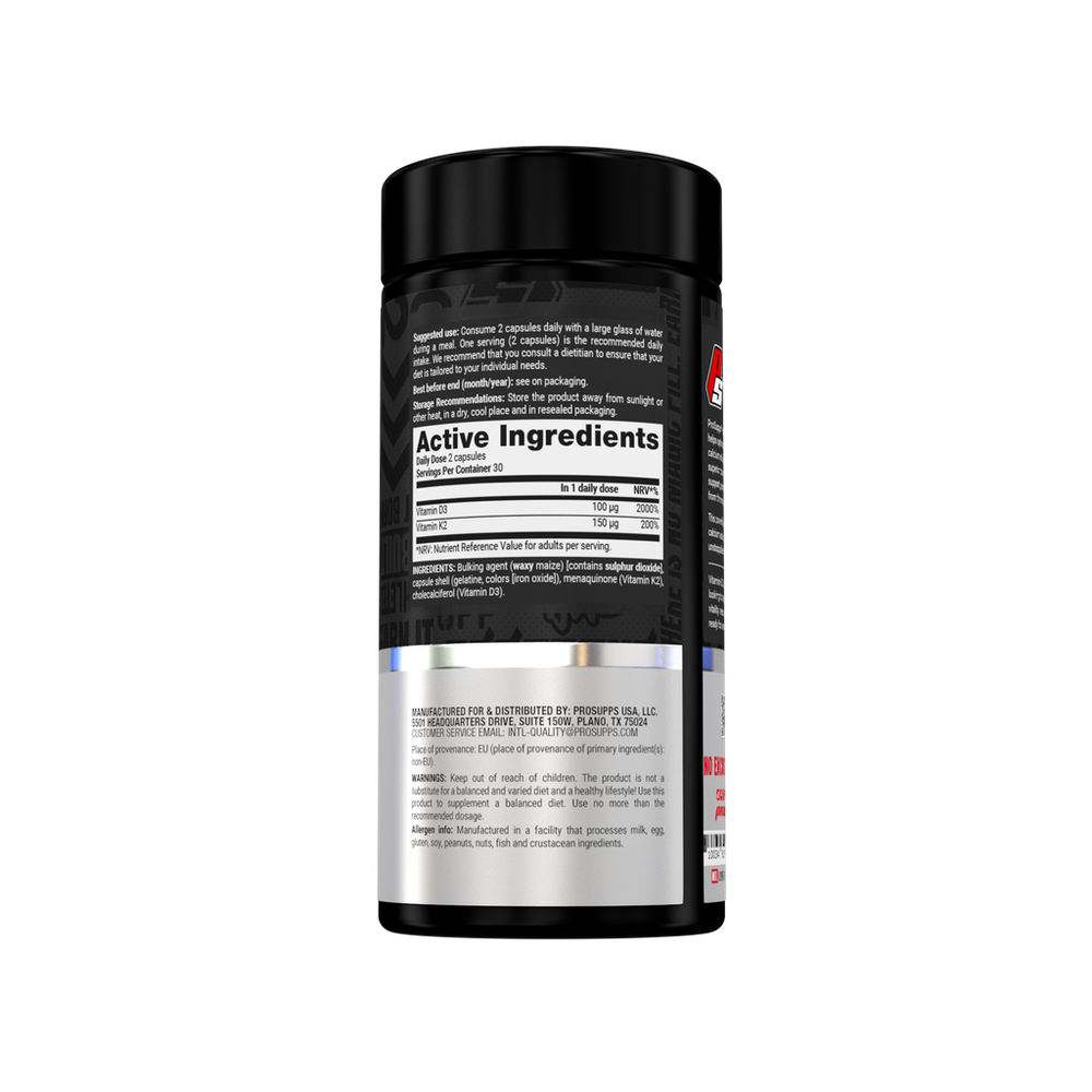 ProSupps Vitamin K2 + D3 este un supliment alimentar de înaltă calitate care combină două dintre cele mai puternice vitamine pentru sănătatea oaselor, susținerea sistemului imunitar și sănătatea cardiovasculară. Vitamina D3 (colecalciferol) ajută la menținerea nivelului normal de calciu în sânge și susține sistemul imunitar, în timp ce vitamina K2 (menaquinona-7) asigură transportul calciului către locurile potrivite – cum ar fi scheletul – și nu către artere.